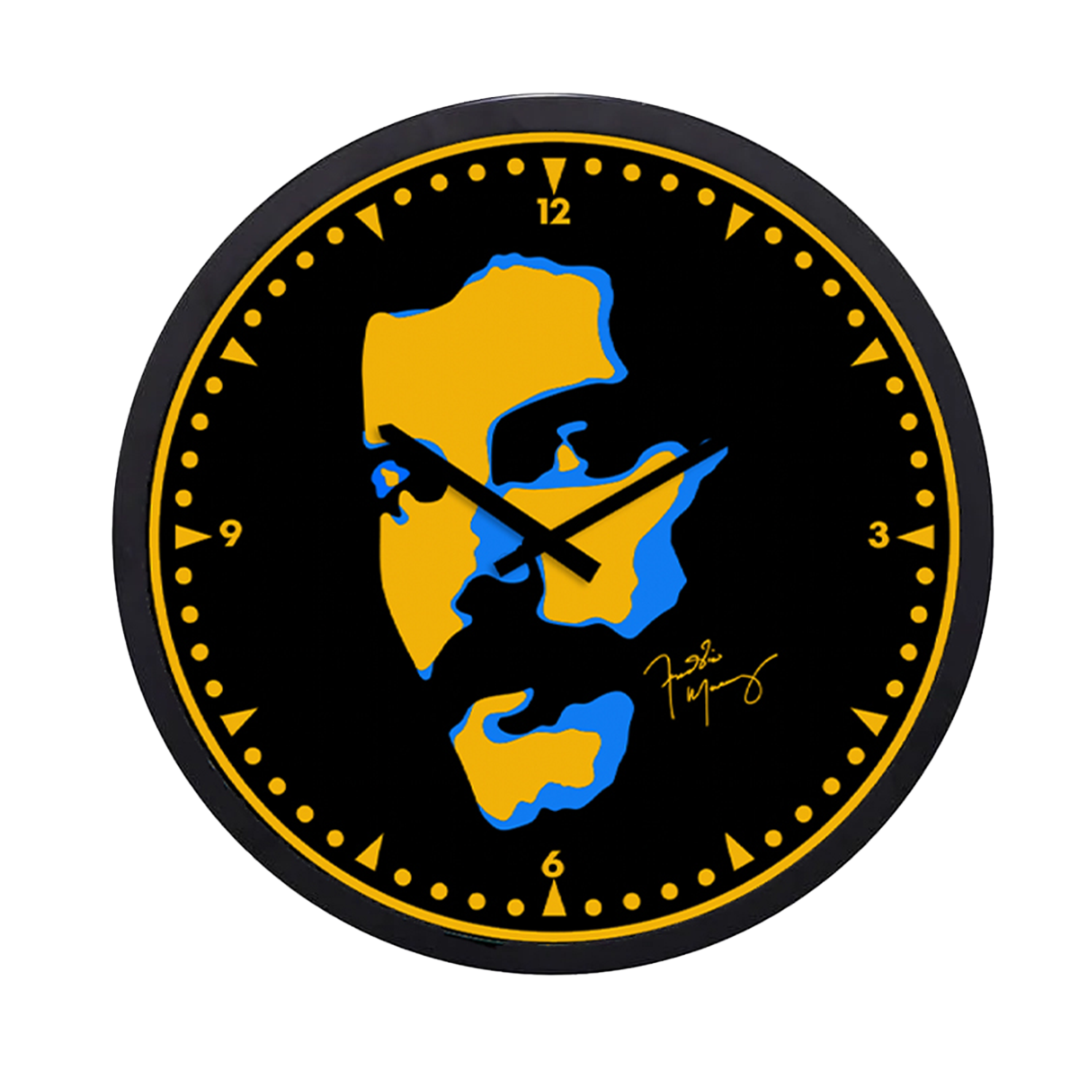 Dark navy clock featuring Freddie Mercury signature artwork.